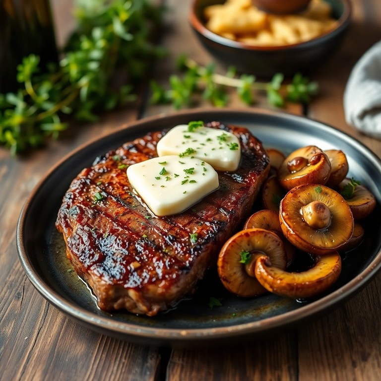 Saftiges Rumsteak mit gebratenen Champignons und Kräuterbutter