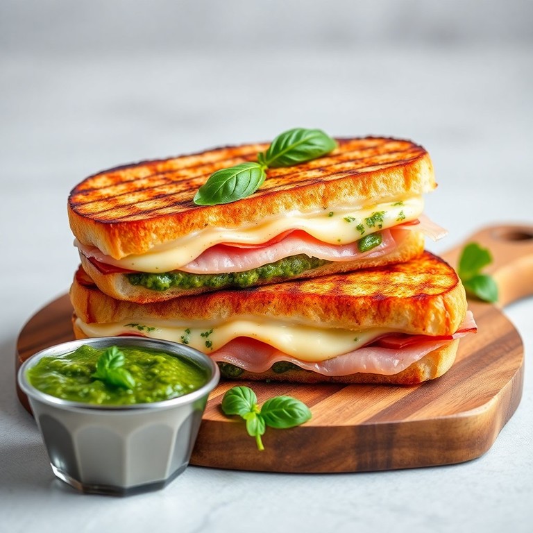Een gegrilde panini boordevol smaak met ham, kaas en een vleugje pesto. Deze heerlijke sandwich is perfect voor een snelle lunch of een lichte avondmaaltijd. De combinatie van gesmolten kaas, sappige ham en aromatische pesto zorgt voor een smaakexplosie.