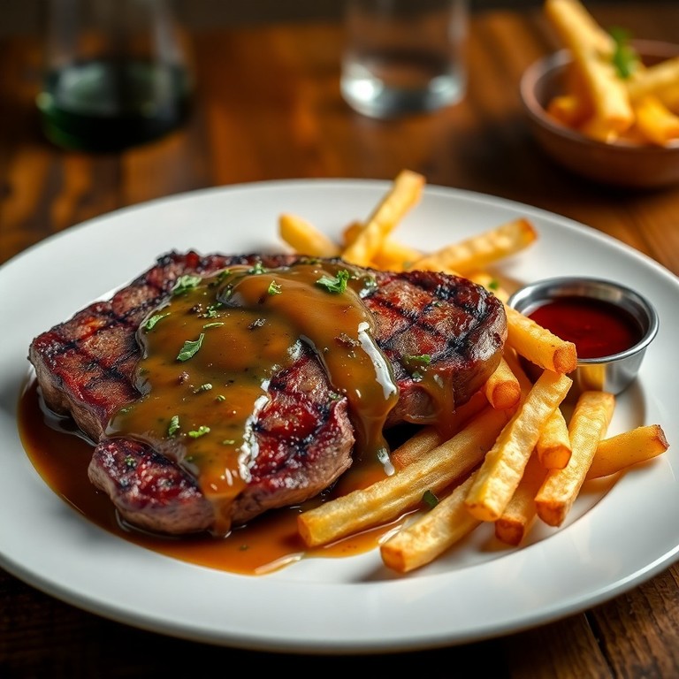 Classic French steak frites featuring seared steak and golden fries, topped with a rich homemade garlic and herb sauce. Perfect for a refined dining experience at home!