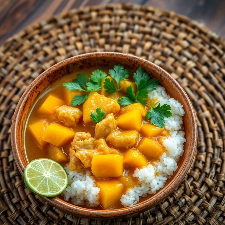 Een exotische curry met kokosmelk, malse stukjes kip, zoete mango en aardappelen. Serveer met rijst voor een complete maaltijd.