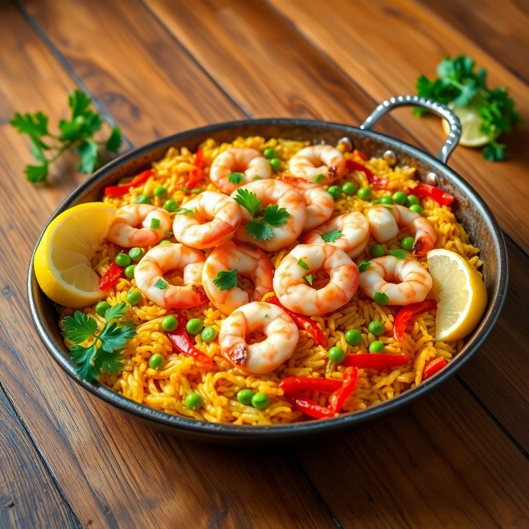 Uma tradicional paella espanhola com camarões suculentos, arroz aromatizado com açafrão, pimentões coloridos e ervilhas, perfeita para uma refeição festiva e saborosa.
