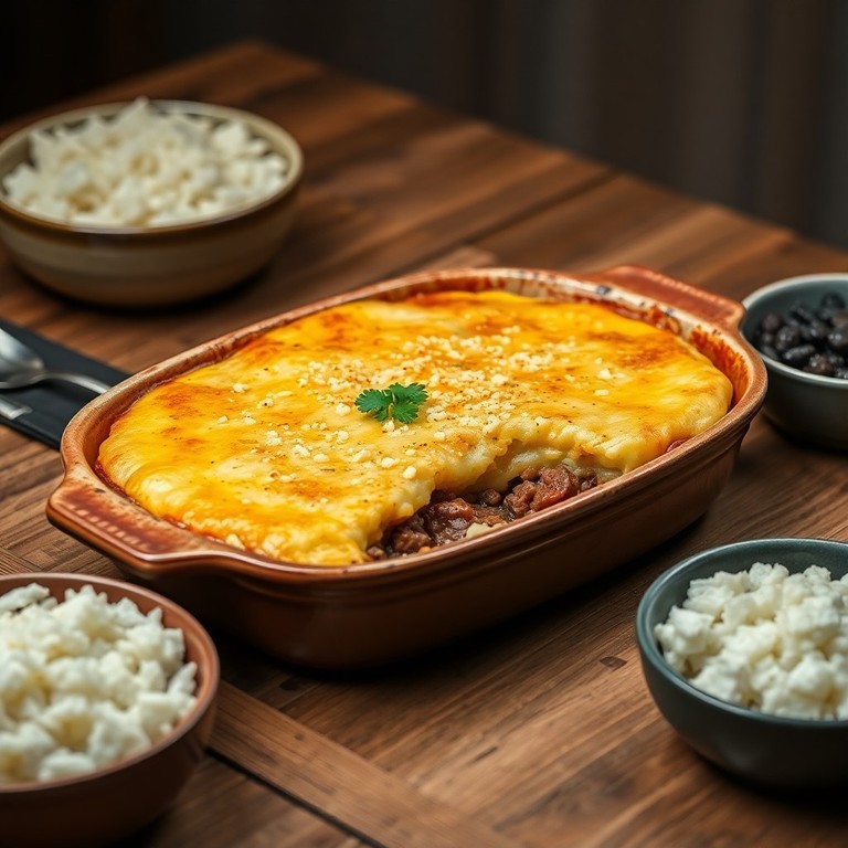 Delicioso escondidinho que combina carne moída refogada com um cremoso purê de batata, uma opção prática e saborosa para refeições familiares.