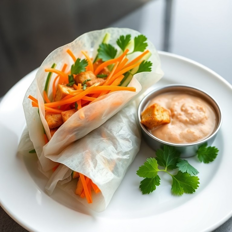 Knackige Gemüsebögen aus Möhren und Gurken, umhüllt von zartem Reispapier, gefüllt mit aromatisch mariniertem Tofu und frischen Kräutern. Dieser leichte, proteinreiche asiatische Wrap eignet sich perfekt als gesunder Snack oder leichte Mahlzeit.