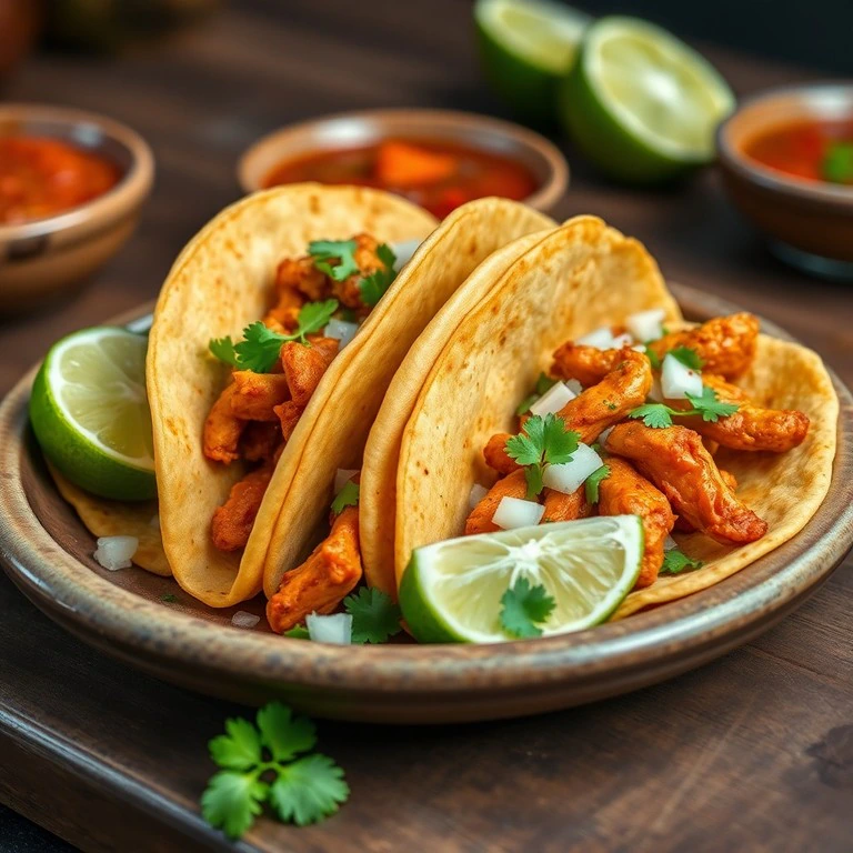 Deliciosos tacos con tiras de pechuga de pollo sazonadas con chipotle y especias, servidos en tortillas de maíz calientes y acompañados de cebolla, cilantro y salsa fresca. Perfectos para quienes disfrutan de un toque picante en su comida.