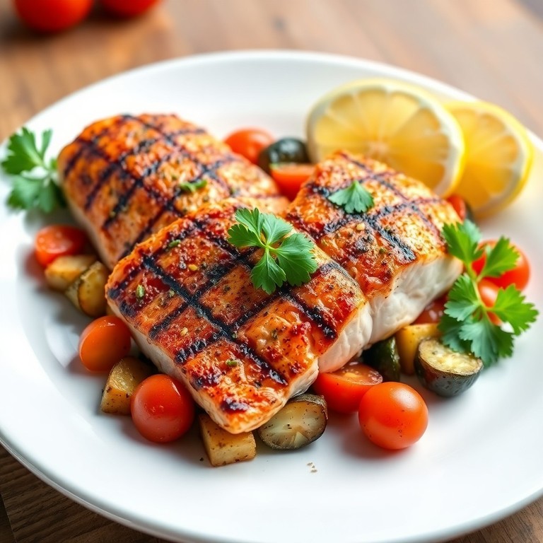 Een lichte, caloriearme en eiwitrijke maaltijd met gegrilde zalm, frisse citroen en een kleurrijke mix van geroosterde groenten zoals paprika, courgette en cherrytomaten. Perfect voor een gezonde lunch of diner.
