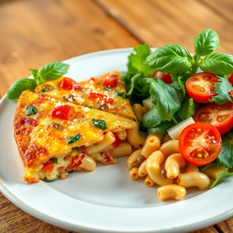 Een stevige Italiaanse stijl frittata met macaroni en groenten, geserveerd met een frisse groentensalade. Dit hartige ontbijt combineert zachte eieren, beetgare macaroni en knapperige groenten voor een voedzame start van de dag.