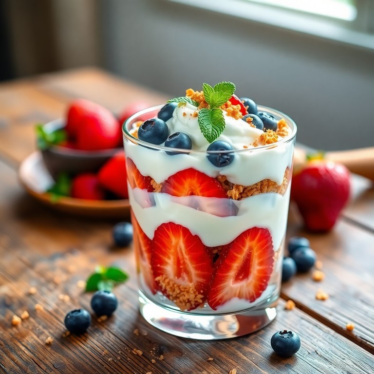 Un petit déjeuner sain et sucré combinant yaourt nature, fruits frais et granola croustillant, idéal pour commencer la journée avec énergie en seulement 10 minutes. Ce parfait équilibré apporte environ 400 calories, parfait pour une matinée pleine de vitalité.