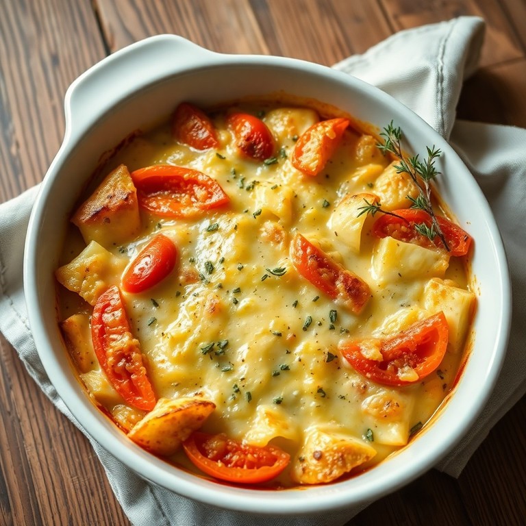 Deze romige ovenschotel combineert zachte aardappelschijfjes, knapperige venkel en geroosterde gele en rode paprika's tot een smaakvol en verwarmend gerecht. Perfect voor een cozy diner, met een rijke saus op basis van room en kaas die alles mooi samenbrengt. Een ideale manier om groenten en aardappelen in een elegante ovenschotel te verwerken.