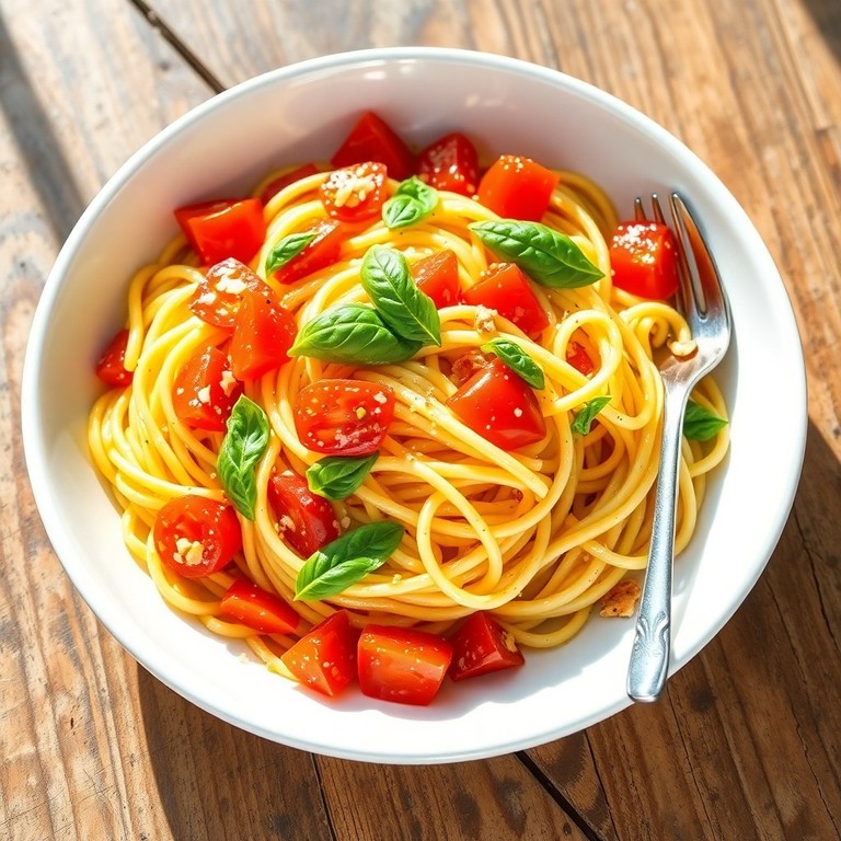 Een lichte, kaasvrije spaghetti die de frisse smaken van verse tomaten en basilicum viert. Deze zomerse pasta is eenvoudig te bereiden met slechts twee kookvuurtjes en gebruikt alleen natuurlijke ingrediënten voor een pure smaakervaring. Perfect voor een warme dag waarop je zin hebt in iets verfrissends en lichts zonder kaas.