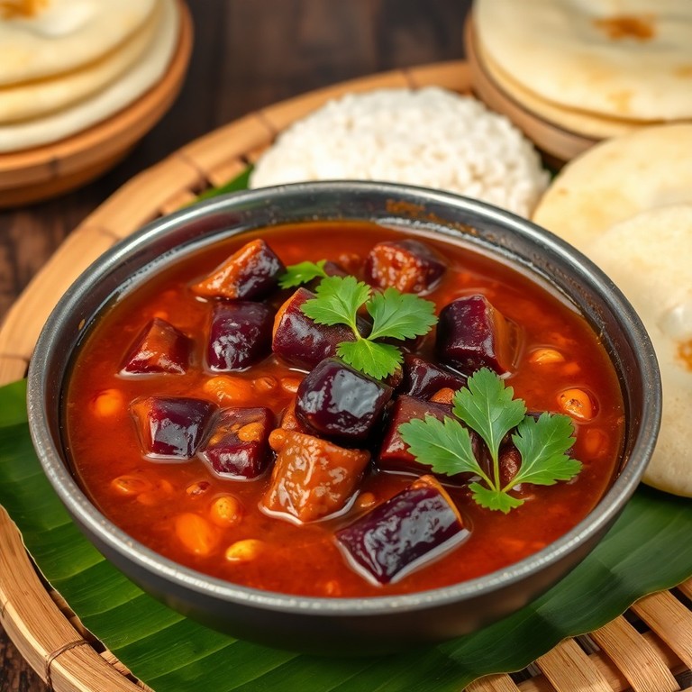A classic, flavorful South Indian lentil stew featuring tender brinjal (eggplant) simmered in a spicy tamarind and sambar spice base. This hearty dish is perfect served hot alongside steamed rice or soft idli, offering a comforting and aromatic experience typical of traditional South Indian cuisine.