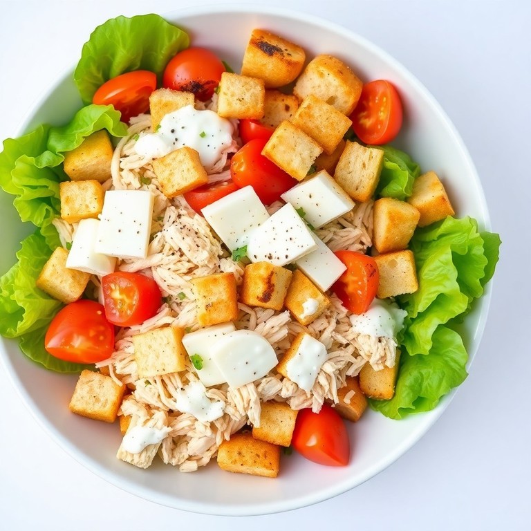 Uma salada refrescante e leve que combina alface crocante, tomates suculentos, frango desfiado e um molho cremoso de iogurte natural. Acrescenta pedaços de pão de forma tostado para textura e mussarela derretida para um toque suave, perfeita para dias quentes e refeições rápidas.