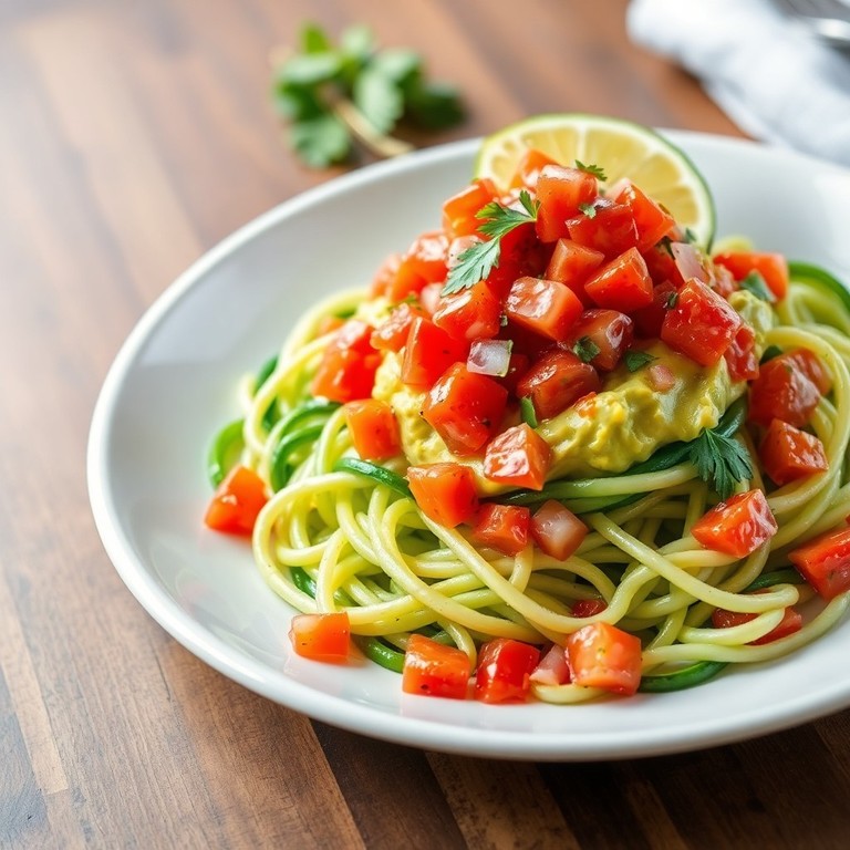 Een lichte en frisse pasta-alternatief met courgette-noedels, rijk aan gezonde vetten dankzij de romige avocado, geserveerd met een pittige en frisse tomatensalsa. Perfect als een gezonde avondmaaltijd geïnspireerd op Indiase smaken, zonder de traditionele pasta te gebruiken.