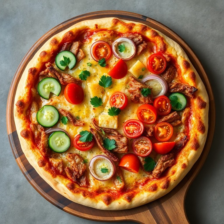 Diese Gyros-Pizza vereint das Beste aus zwei Welten: würziges Gyros-Fleisch auf einem herrlich knusprigen Pizzaboden, belegt mit frischem Gemüse und geschmolzenem Käse. Das Gericht ist ideal für ein gemütliches Abendessen und begeistert mit mediterranen Aromen und einer tollen Textur. Perfekt für alle, die Pizza und Gyros lieben!