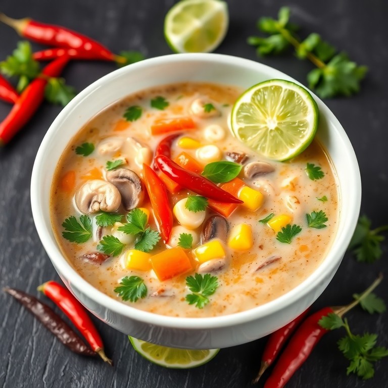 A vibrant, plant-based take on the classic Thai coconut soup, this Spicy Vegetable Tom Kha is brimming with fresh vegetables, aromatic herbs, and just the right amount of heat. Creamy coconut milk melds with lemongrass, galangal, and kaffir lime leaves to create a fragrant broth, while a medley of mushrooms, bell peppers, and baby corn add texture and color. This comforting soup is quick to prepare, making it perfect for busy weeknights or an impressive appetizer for a Thai-inspired meal.