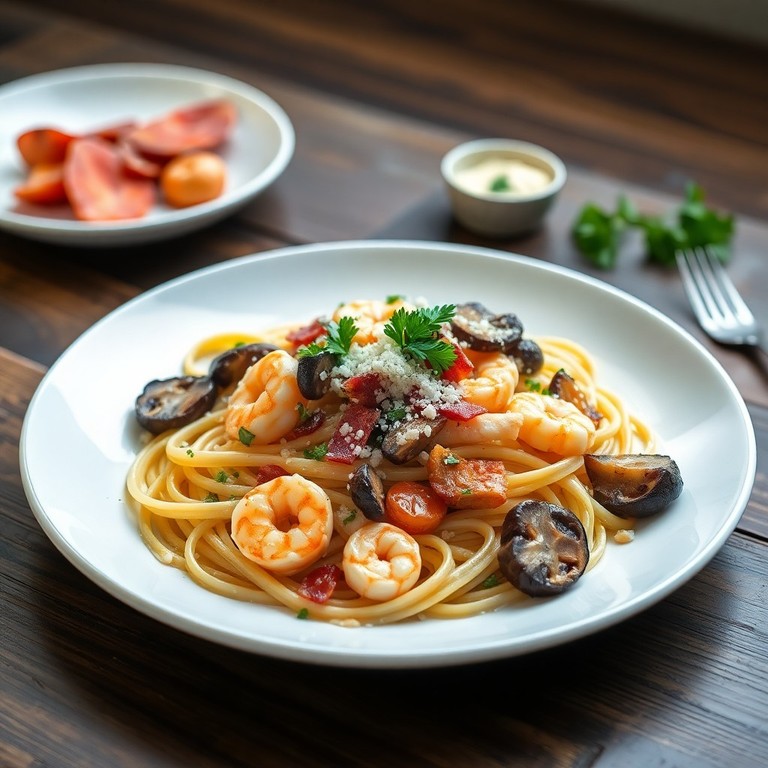 Aubergine en Garnalen Pasta met Verse Paddenstoelen en Griekse Yoghurt
