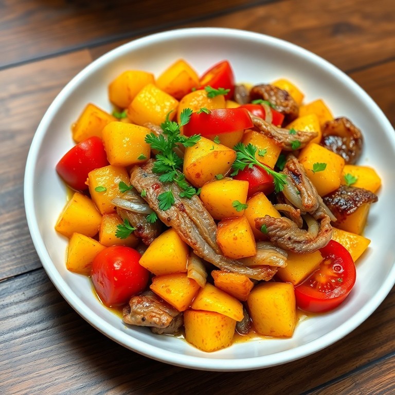 Un plato lleno de sabor y listo en menos de 30 minutos, combinando carne de cerdo jugosa, tomate fresco y papas amarillas en un salteado delicioso y nutritivo. Ideal para una cena rápida y reconfortante, esta receta aprovecha ingredientes sencillos para crear un equilibrio perfecto entre texturas y sabores.