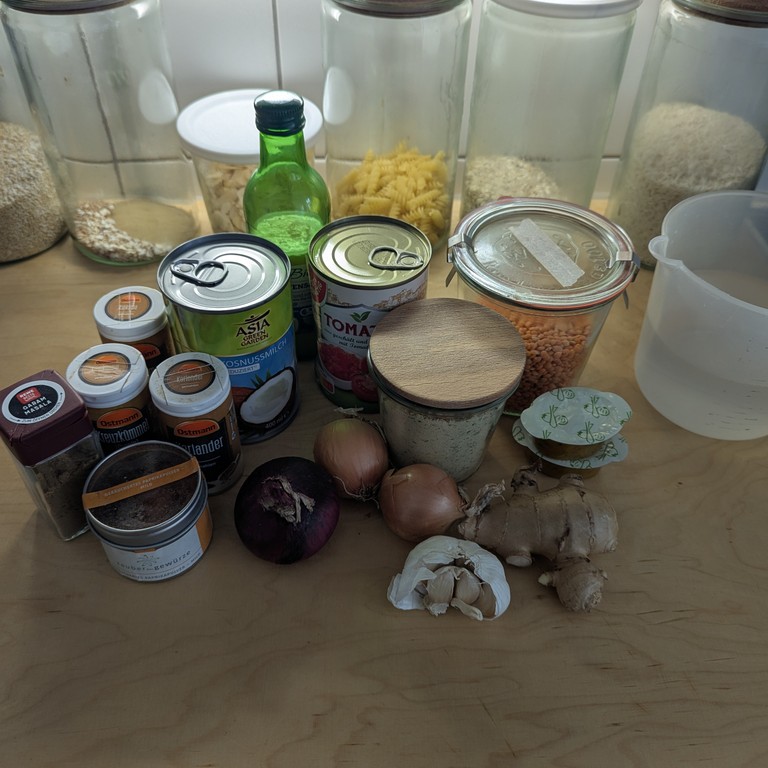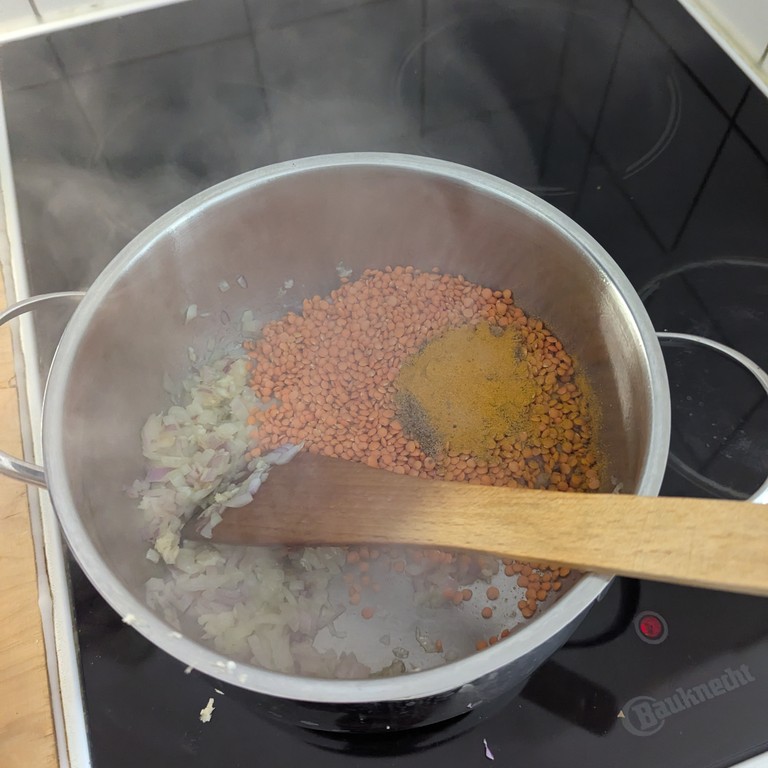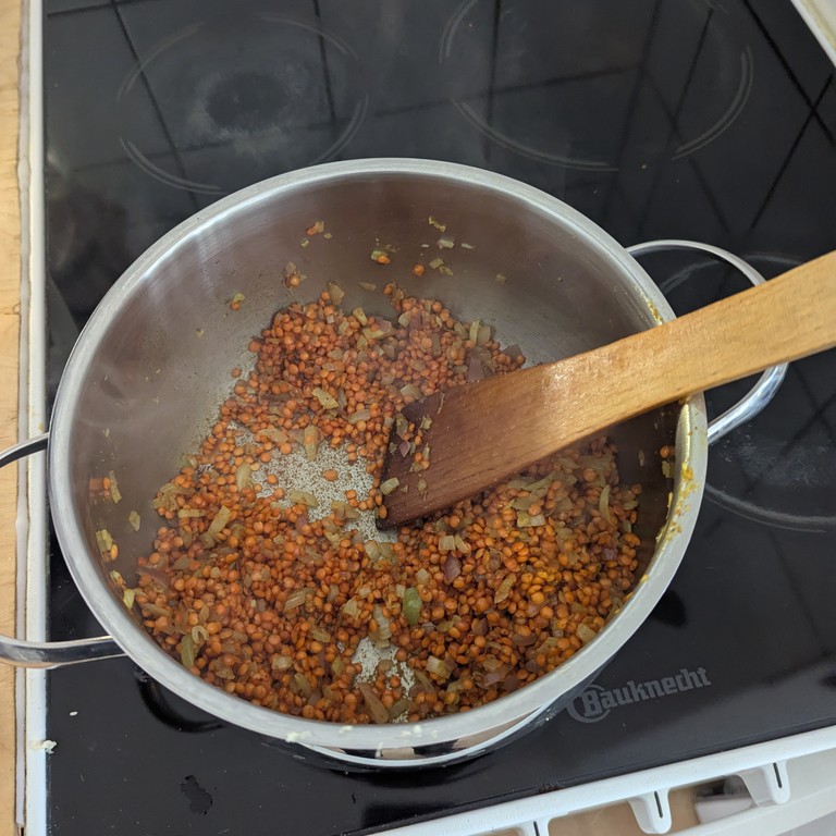 Mit Reis servieren, wenn du lieber eine Suppe willst: weniger Linsen, mehr Gemüsebrühe.