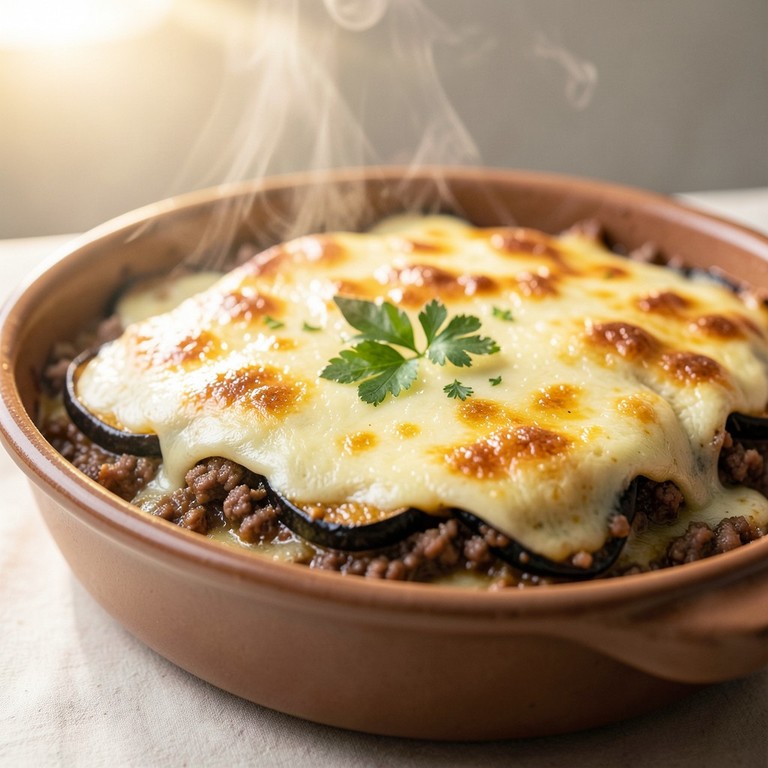 Un plat grec réconfortant à base d'aubergines, de viande hachée et d'une sauce béchamel crémeuse, mijoté à la perfection.