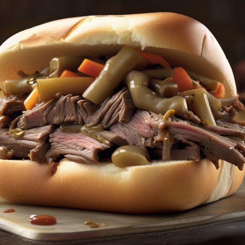 A delicious and savory sandwich that features thinly sliced slow-cooked beef simmered in flavorful au jus, served on a crusty Italian roll with giardiniera or sweet peppers.