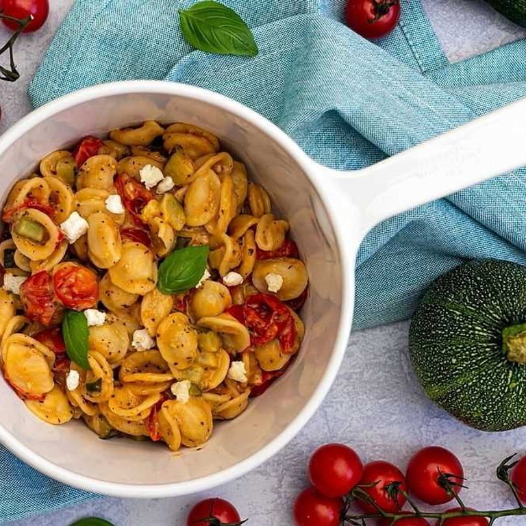 Macarrão "One Pot" com Abobrinha, Tomate e Queijo de Cabra