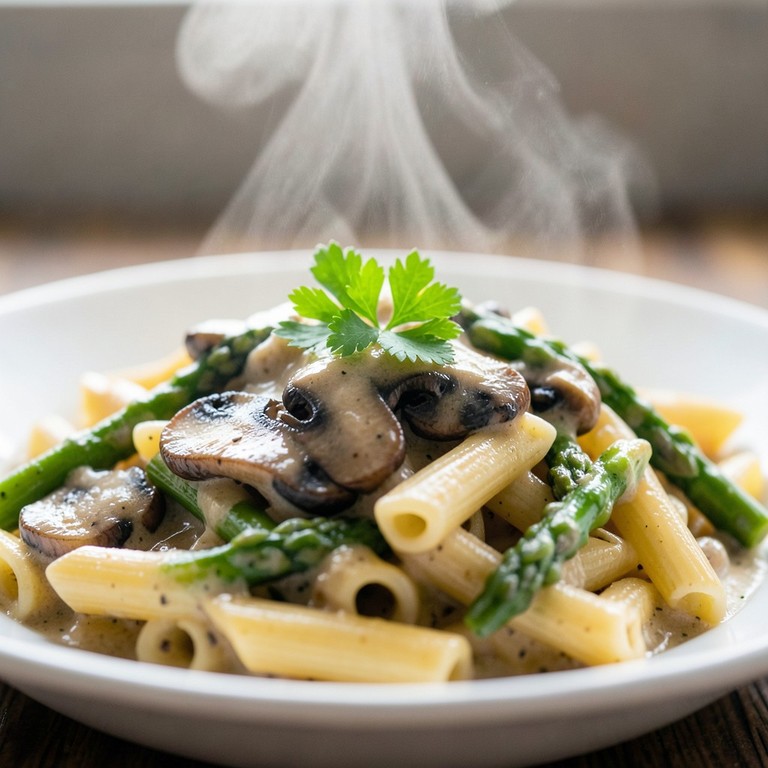 - Macarrão Cremoso com Cogumelos e Aspargos Frescos (Vegano)