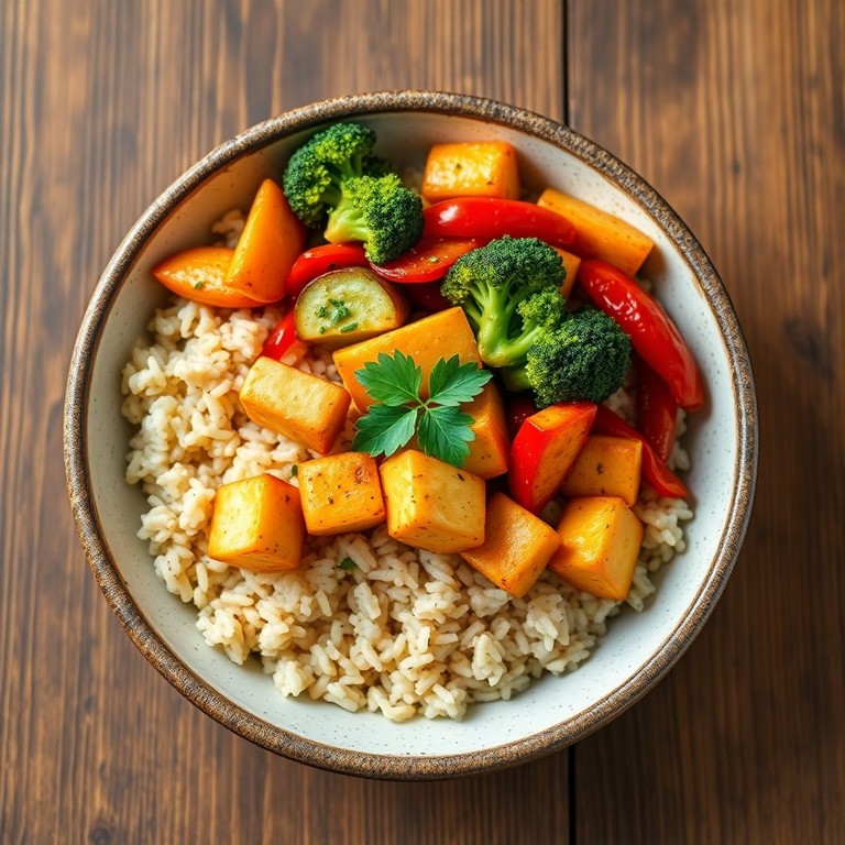 Bowl de Arroz Integral com Legumes e Tofu Saboroso
