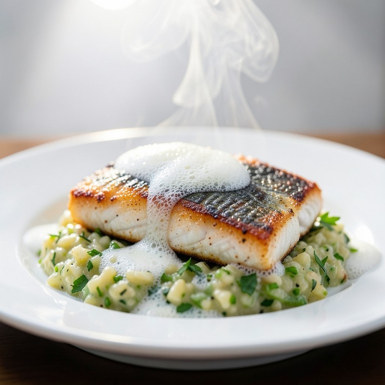 Klassisches Gebratenes Forellenfilet auf Bärlauchrisotto mit Zitronenschaum