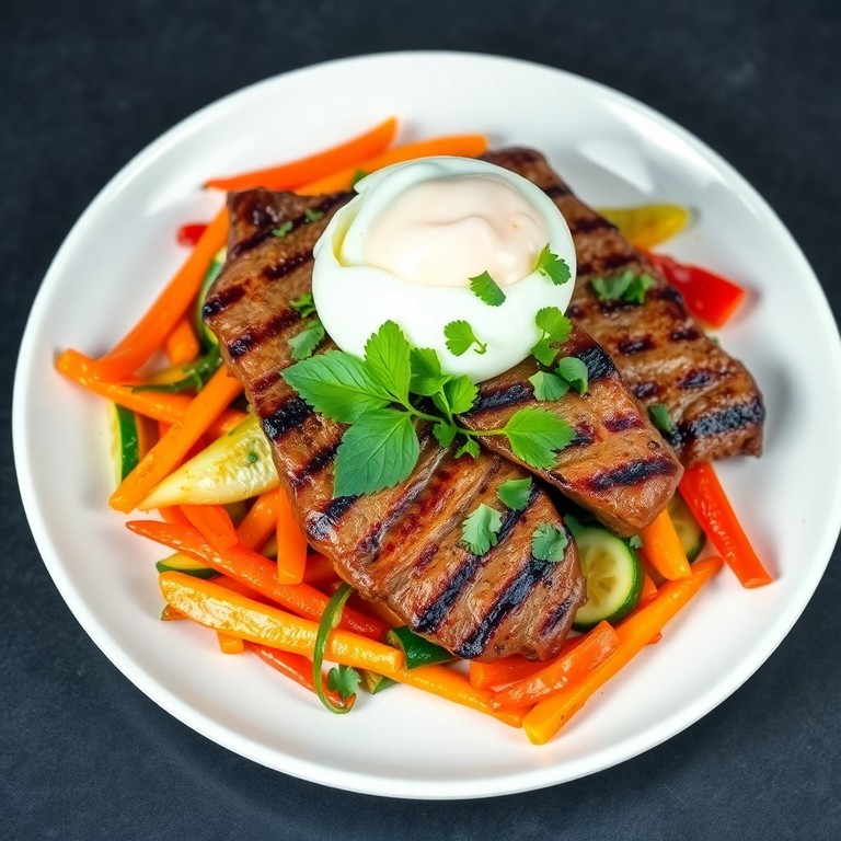 Bife Magro com Legumes Salteados e Ovo Pochê