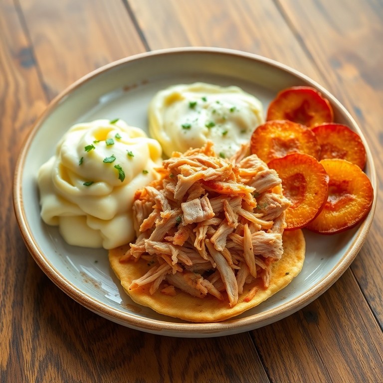 Tostadas de Pernil con Puré de Papa y Plátano Frito