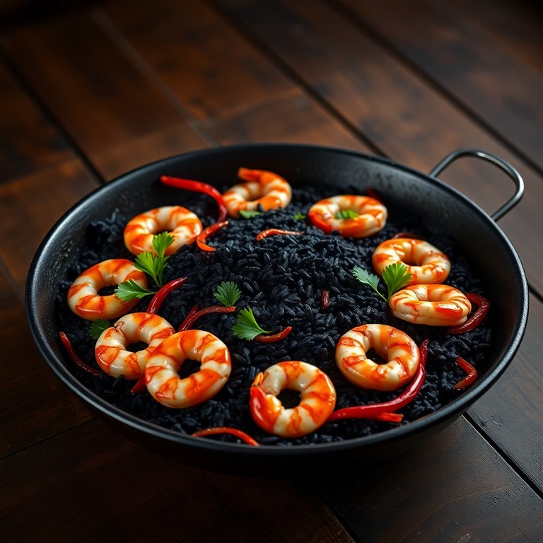 Paella de Camarão e Arroz Negro (Paella de Frutos do Mar com Arroz Tinta de Lula)