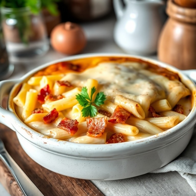 Gratinado de Batata e Macarrão com Bacon ao Creme