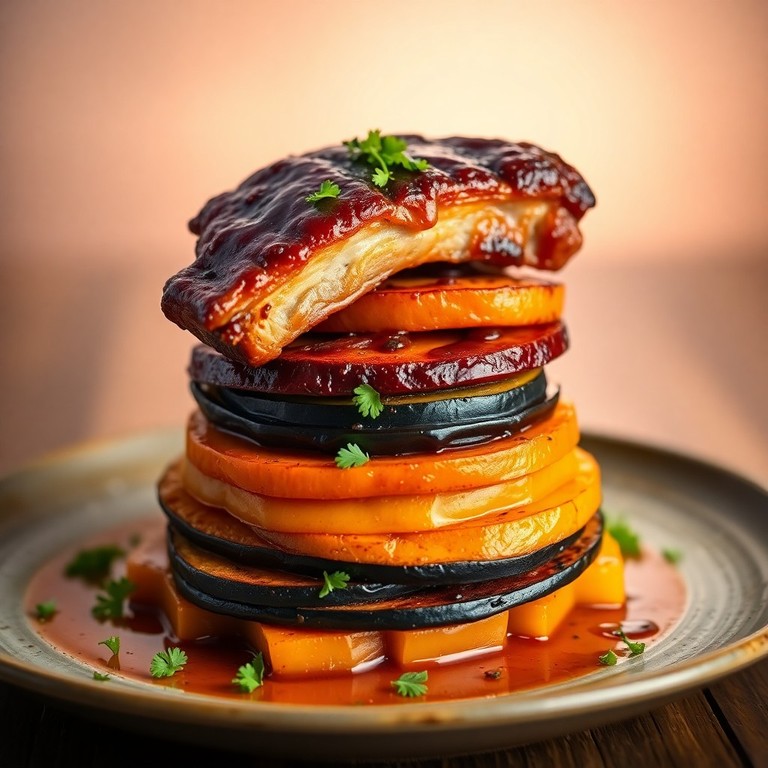 - Roasted Sweet Potato and Eggplant Stack with Glazed Ribs