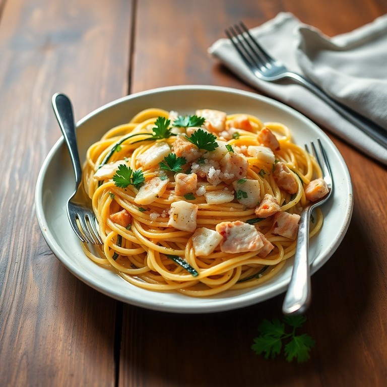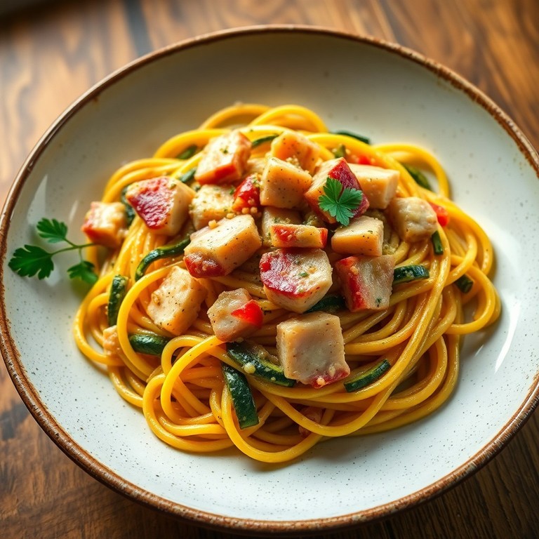 - Spaghetti au thon, courgettes sautées, pâte de curry verte et lait de coco