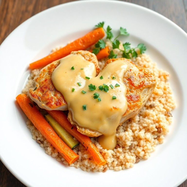 - Boulgour au poulet, crème moutarde et légumes sautés