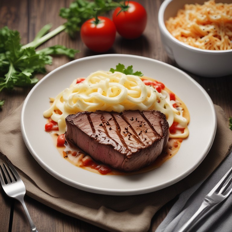 Bife com Queijo Ralado, Massa de Nata, Cebola e Tomate