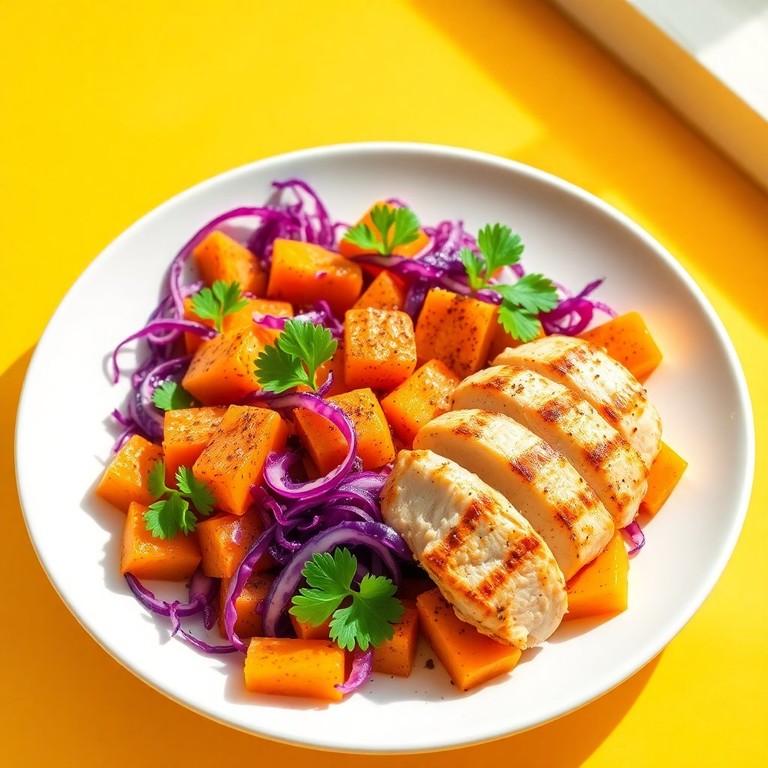 Salada Colorida de Frango Grelhado com Repolho Roxo e Batata Doce