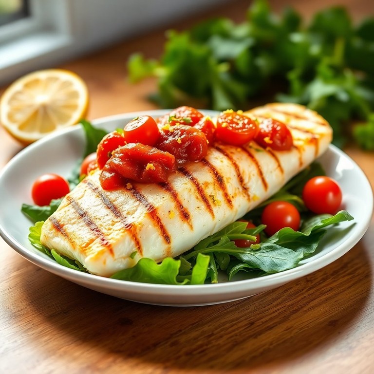 Peixe Grelhado com Molho de Tomate Cereja e Alface Crocante