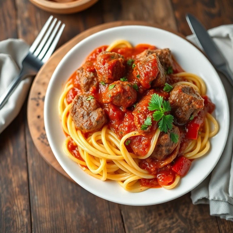 - Guiso de Tallarines con Carne en Salsa Tomate