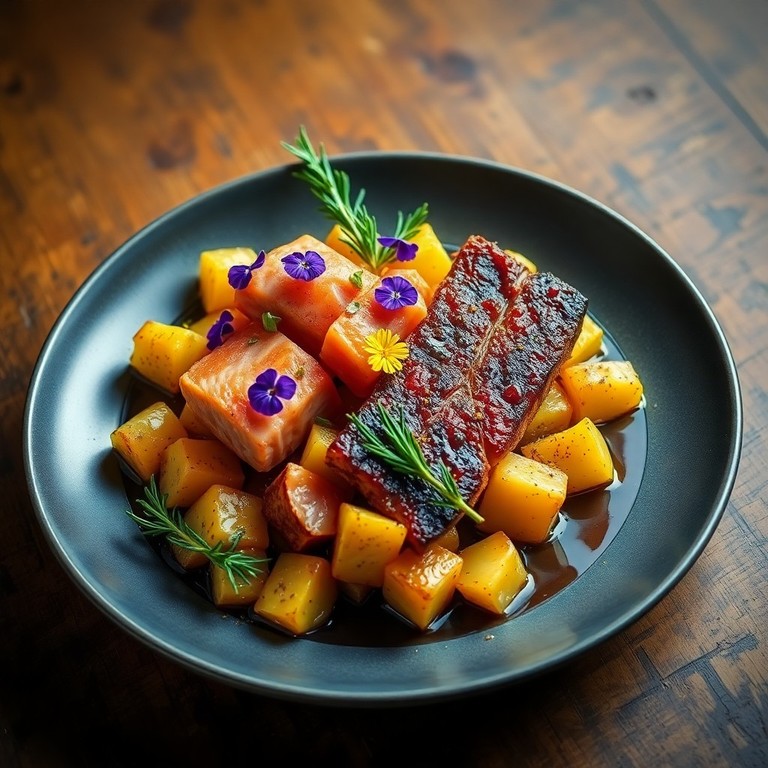 Cubos de Picanha e Salmão com Batatas Salteadas e Flores Comestíveis
