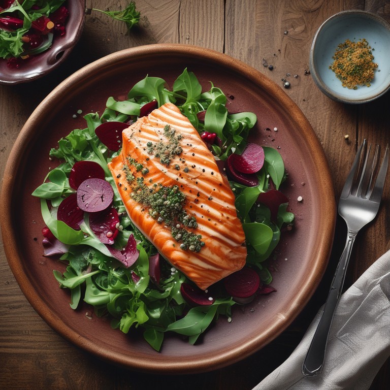 Salmão Grelhado com Purê de Beterraba e Salada de Espinafre e Rúcula