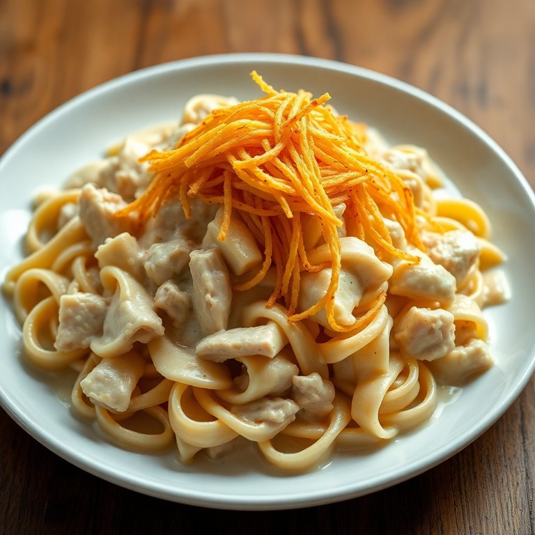 Macarrão Cremoso com Frango Desfiado e Batata Palha