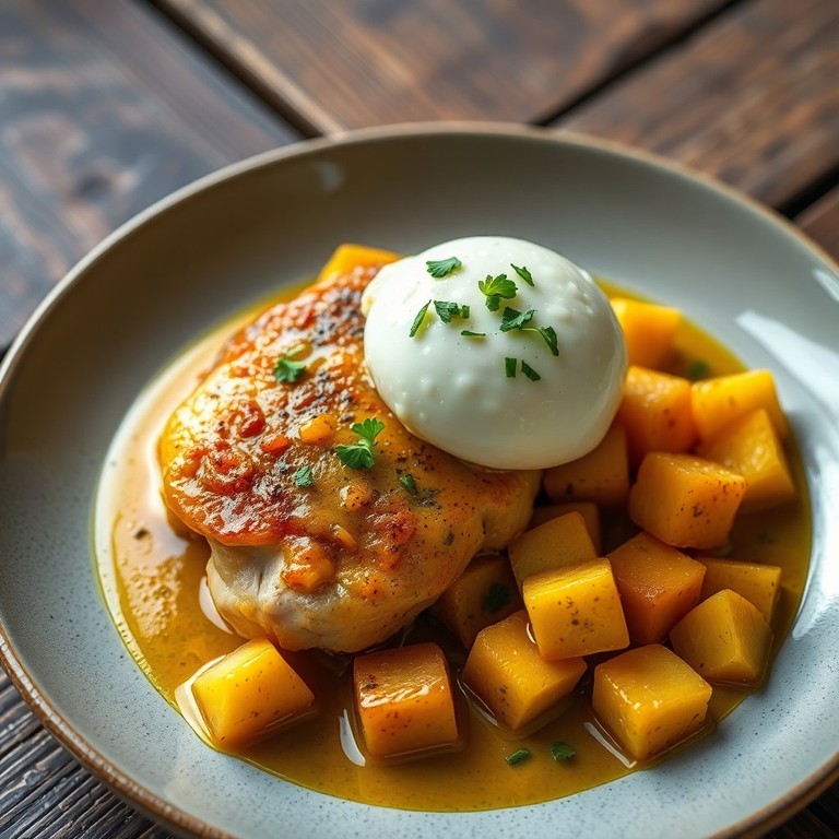 Frango ao Curry com Batatas ao Forno e Ovo Poached