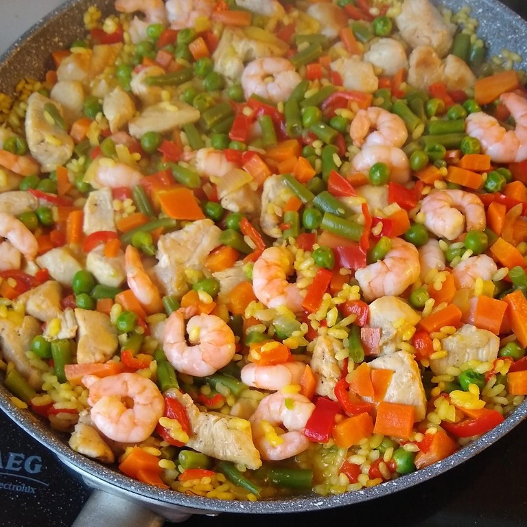 Paella mit Huhn und Garnelen