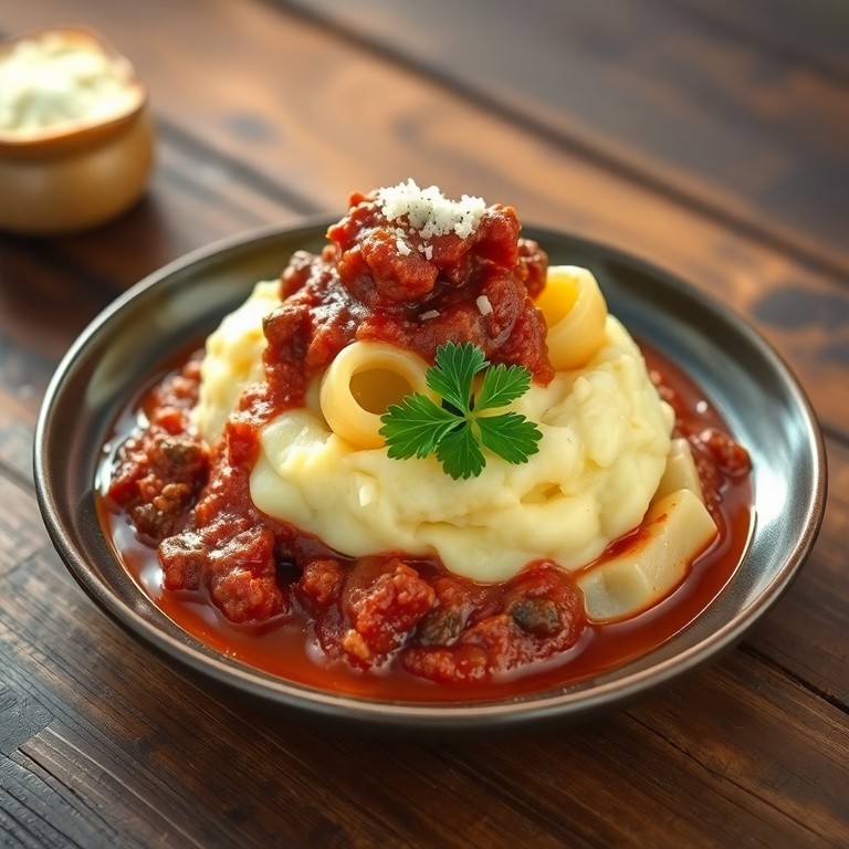 Ragu de Linguiça Aconchegante com Purê de Batata Cremoso e Ninhos de Macarrão