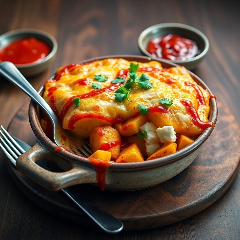 Spicy Potato & Cheese Bake with Schezwan Drizzle