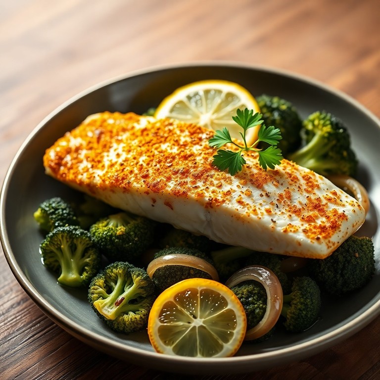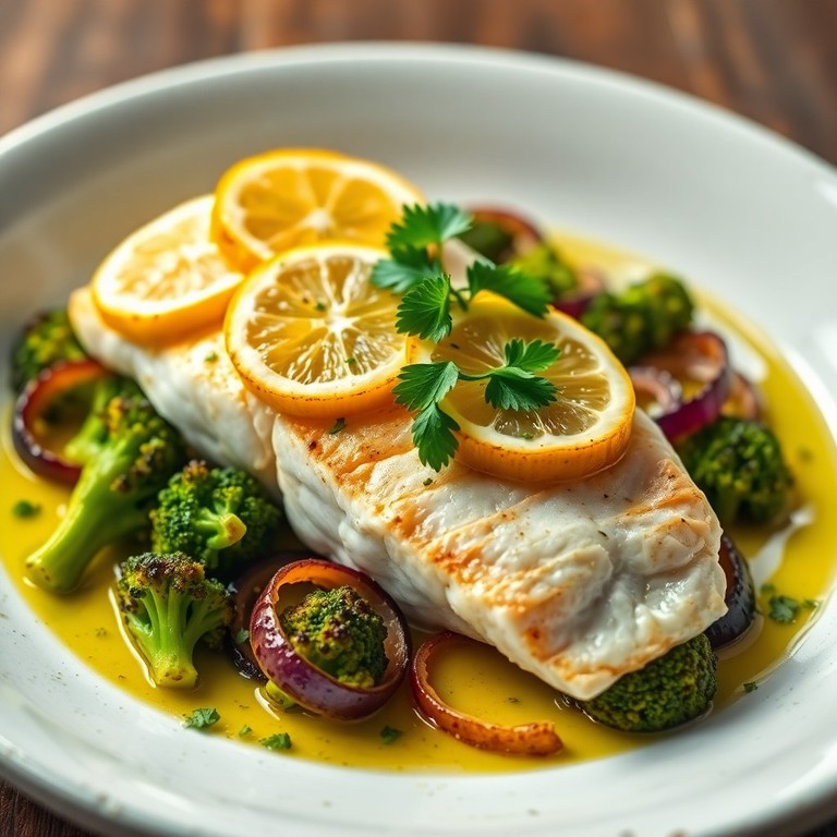 Peixe Assado com Brócolis, Cebola e Limão