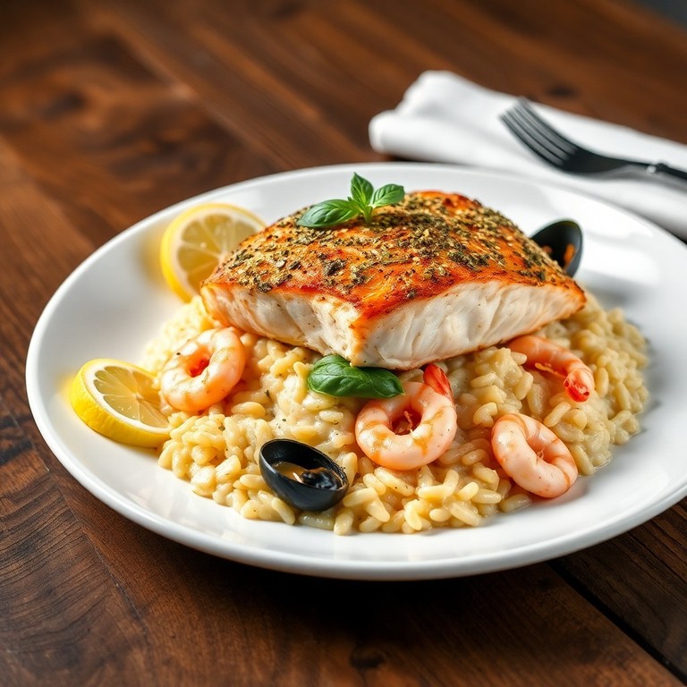 Salmão Assado com Crosta de Ervas e Risoto de Frutos do Mar à Moda Mediterrânea