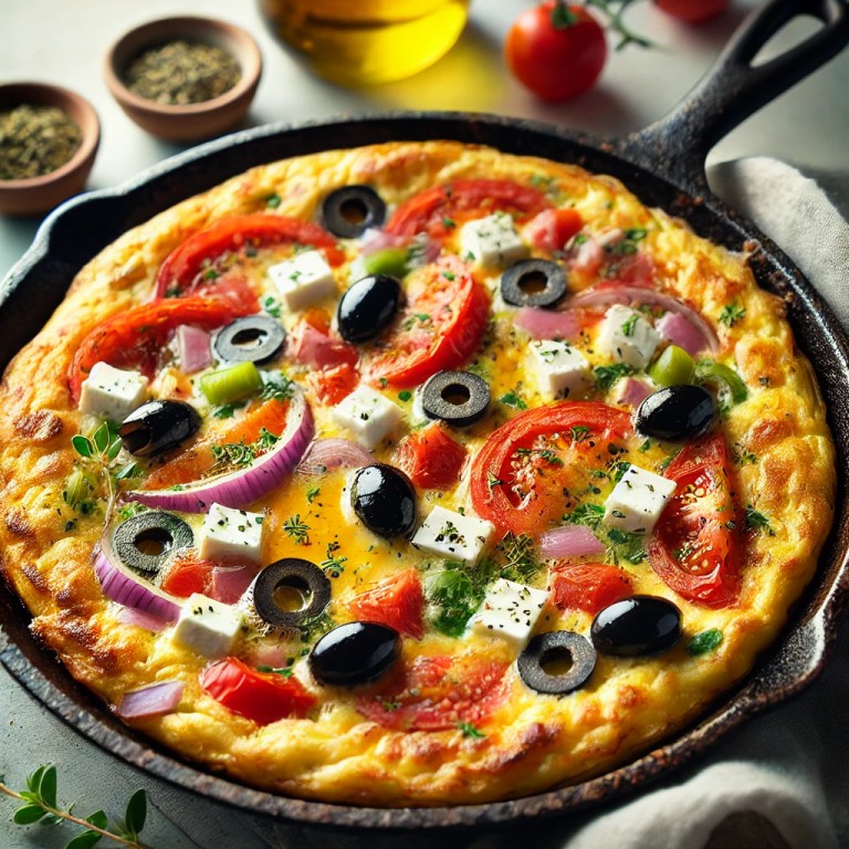 Griechisches Bauernomelett mit schwarzen Oliven, roter Zwiebel und Tomate