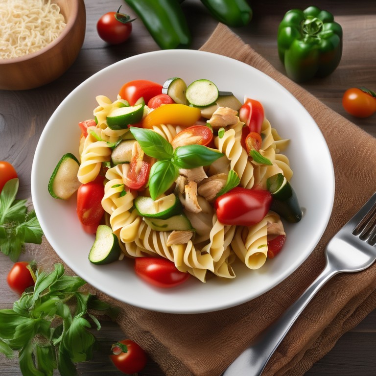Gesunde Pasta mit Paprika, Tomaten, Zucchini und Hühnerfleisch