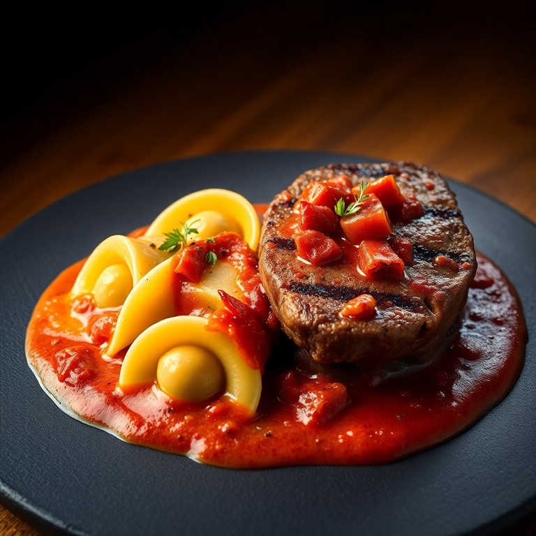 Bife de Maminha ao Molho Cremoso de Passata e Bacon com Ravioli
